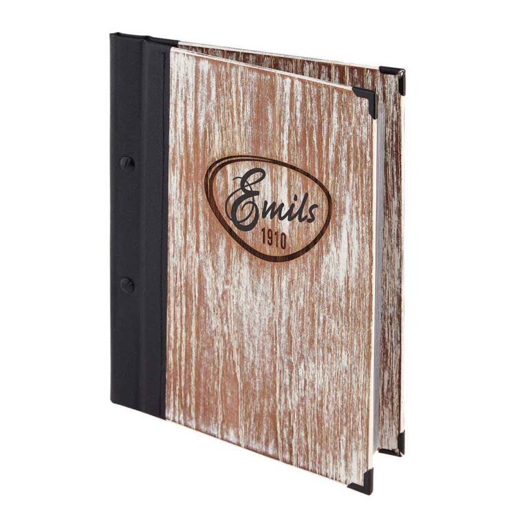 Rustikaler Stil – Materialien wie Holz oder Leder verleihen der Speisekarte eine natürliche und gemütliche Optik.