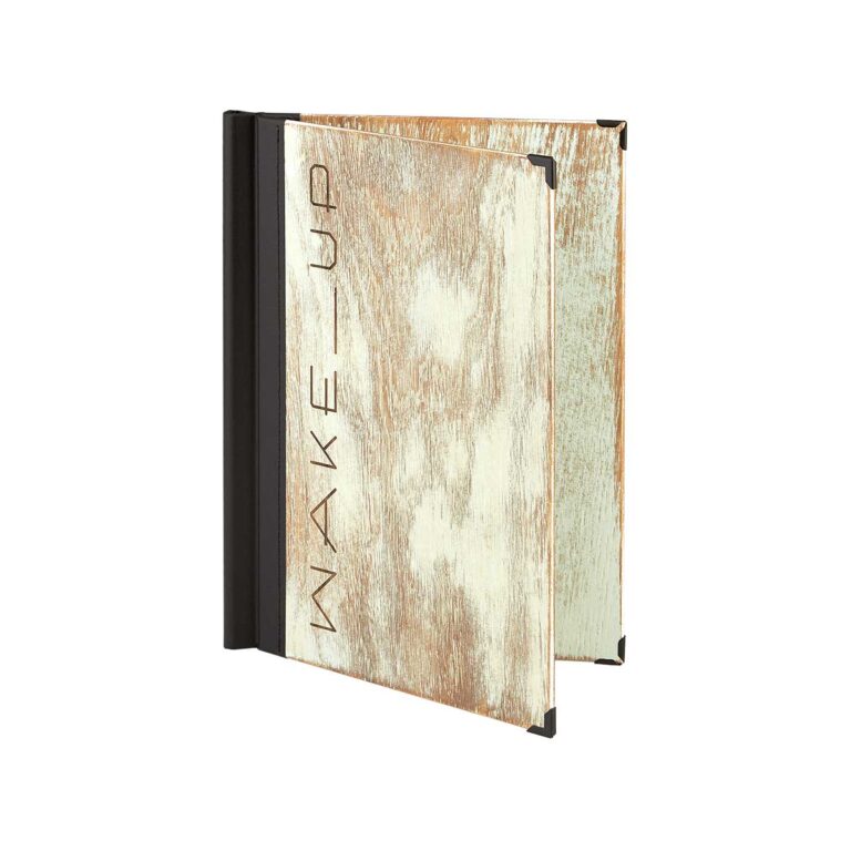 Wake up Speisekarte aus Holz im Vintage-Stil