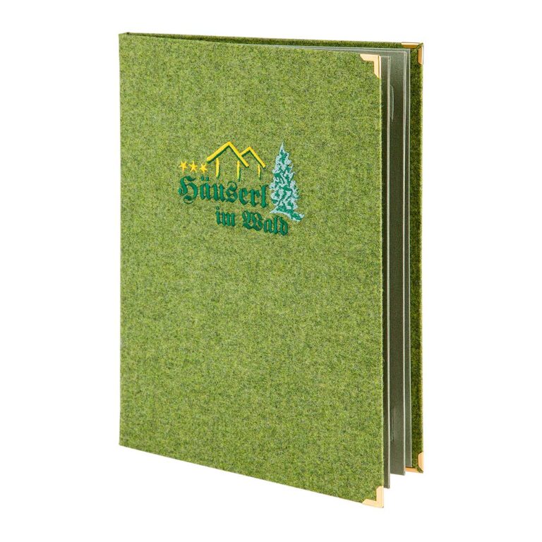 Häuserl im Wald Speisekarte aus Loden in Grün mit Buchbindung